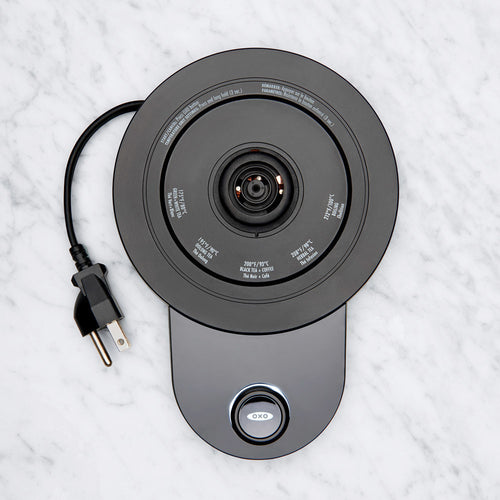With the OXO Brew Adjustable Temperature Kettle, you can select the precise temperature for your tea or coffee with a simple twist of a knob. Choose any temperature between 170 and 212°F, and the water is heated and held at your preferred temperature for up to 30 minutes. The Kettle is cordless when removed from the base, with a silicone base so you can bring it to the table without worrying about damaging surfaces. The crystal-clear, BPA-free borosilicate glass ensures a pure, clean taste.